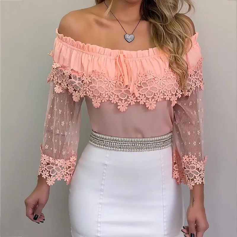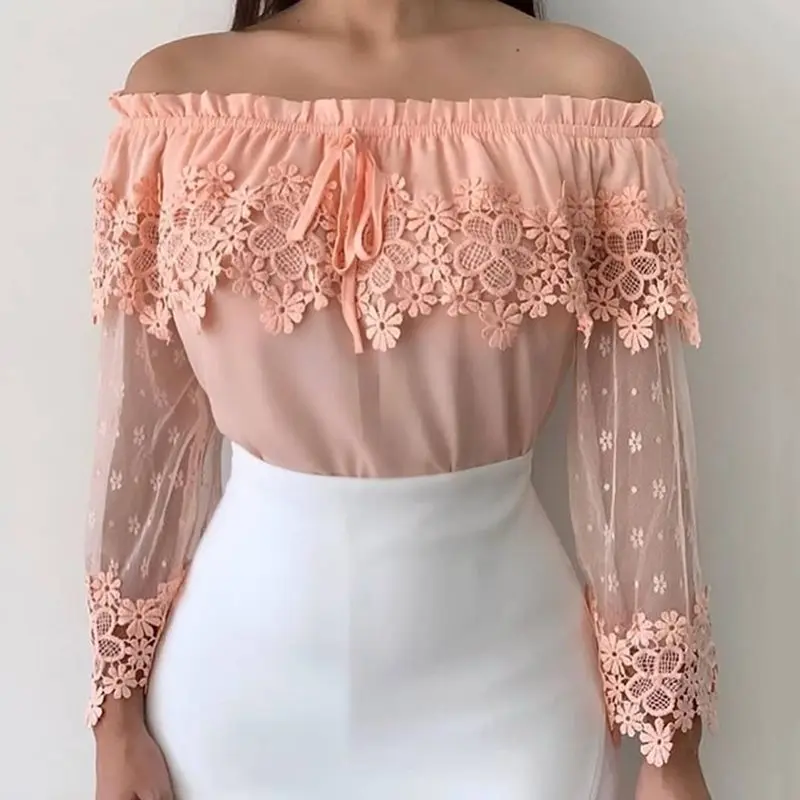 Very best Elegant Orange Sexy Off Shoulder African Plus Size Vintage Blouse Women Slim Falbala Hollow Lace Re