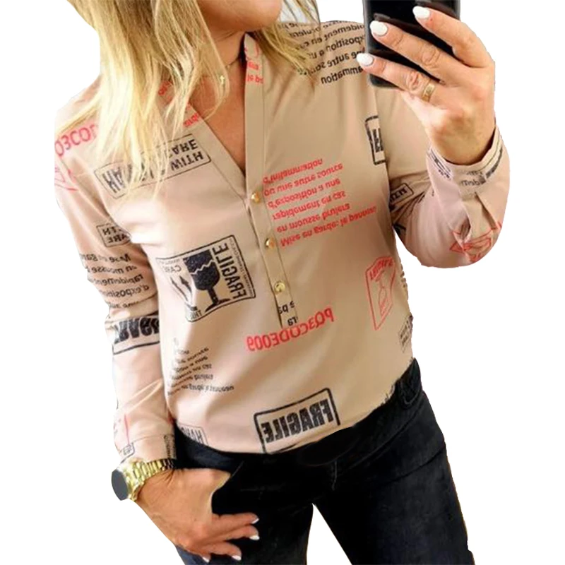 price reduction 2019 Autumn Women Shirts Letters Printed Blouse Fashion White Blusas Button V-neck Casual Tops Half