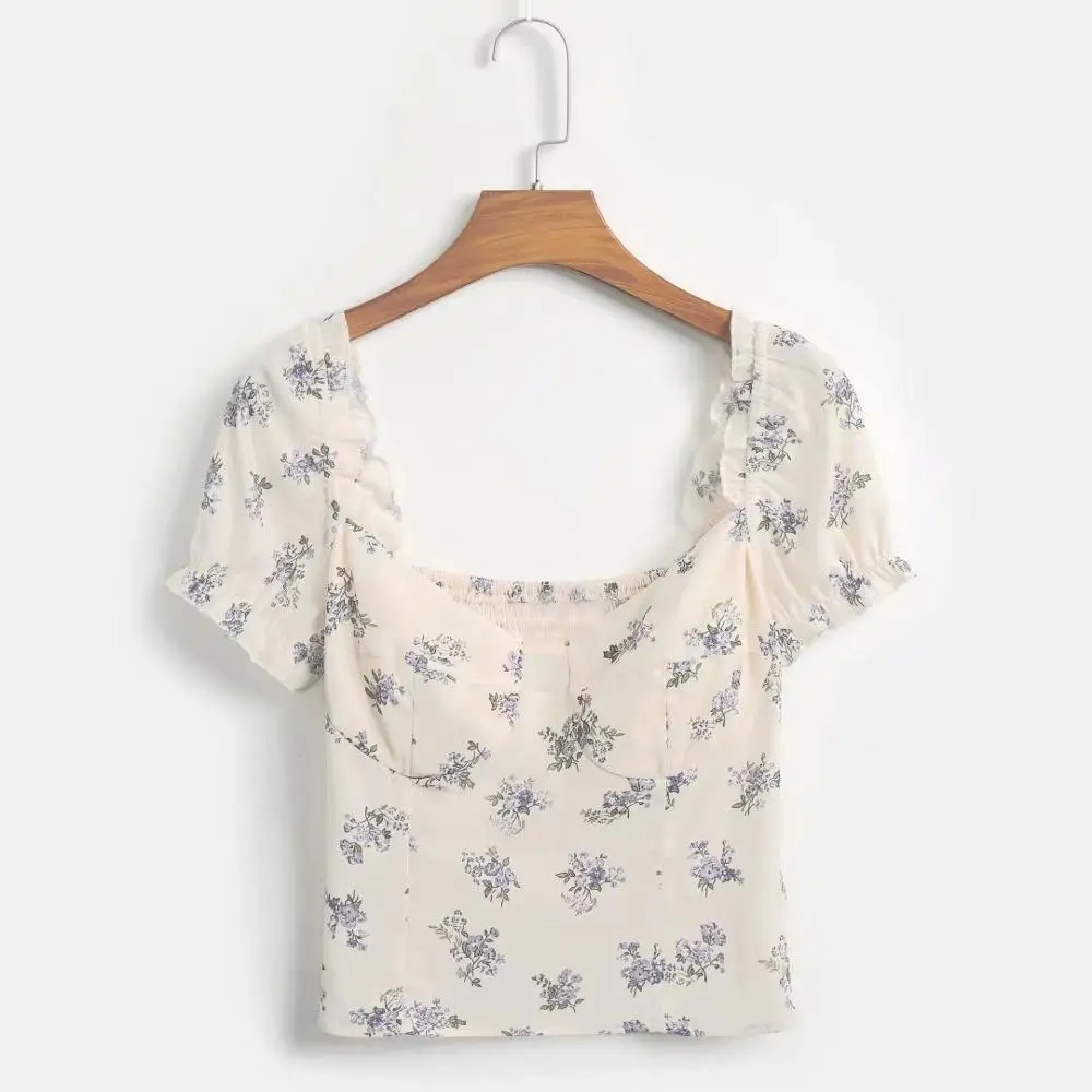 remarkable Vintage french women's blouses and shirts square neck elastic waist sexy crop top short sleeve summ